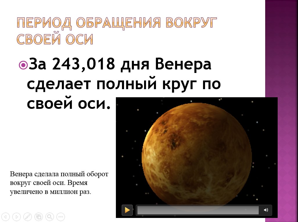 Один из типичных слайдов презентации о планете Венера. Главная информация, которую зрители должны увидеть и запомнить - период обращения Венеры вокруг своей оси. Текст снабжен видео-файлом, иллюстрирующим процесс обращения. Но здесь есть и недочеты. Все элементы этого слайда (их 4: видео с подписью, заголовок, текст слайда) расположены не лучшим образом. Начнем с того, что заголовок лучше всего размещать в одну строку. Видео лучше всего разместить было в центре, а выше на две сроки расположить основной текст. Шрифт стоило бы уменьшить, но выделить число - "243"(без цифр после запятой). А подпись разместить внизу, под видео, и сделать ее менее заметной с помощью уменьшения шрифта, цвета или прозрачности.